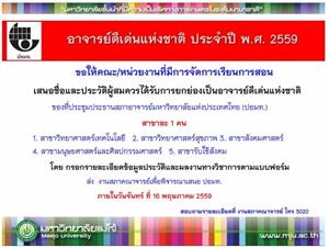 ตามหนังสือ ที่ปอมท. ๕๘๕๙(๑)/ว๑๐ ที่ประชุมประธานสภาอาจารย์มหาวิทยาลัยแห่งประเทศไทย ขอให้เสนอชื่อและประวัติผู้สมควรได้รับการยกย่องเป็นอาจารย์ดีเด่นแห่งชาติของ ที่ประชุมสภาอาจารย์มหาวิทยาลัยแห่งประเทศไทย (ปอมท.) ประจำปี ๒๕๕๙ โดยมีทั้งสิ้นจำนวน ๕ สาขา คือ