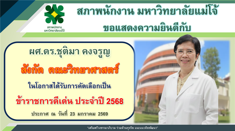 สภาพนักงาน มหาวิทยาลัยแม่โจ้ ขอแสดงความยินดีกับ ผู้ช่วยศาสตราจารย์ ดร.ชุติมา คงจรูญ สังกัด คณะวิทยาศาสตร์ ในโอกาสได้รับการคัดเลือกเป็น ข้าราชการดีเด่น ประจำปี 2568ตามประกาศมหาวิทยาลัยแม่โจ้ ณ วันที่ 23 มกราคม 2569